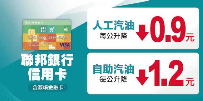 刷聯邦銀行信用卡汽油|人工每公升降0.9元、自助每公升降1.2元