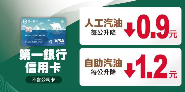 刷第一銀行信用卡汽油|人工每公升降0.9元、自助每公升降1.2元