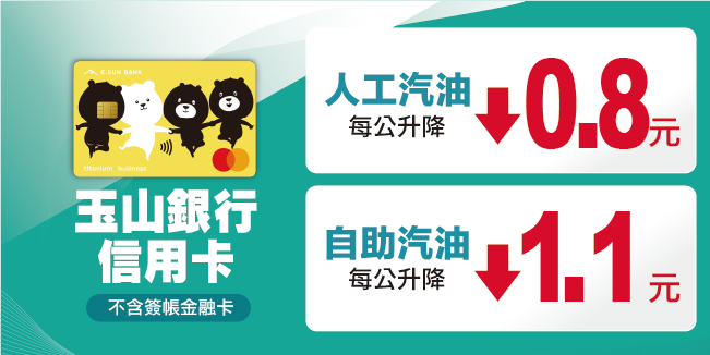 刷玉山銀行信用卡汽油|人工每公升降0.8元、自助每公升降1.1元