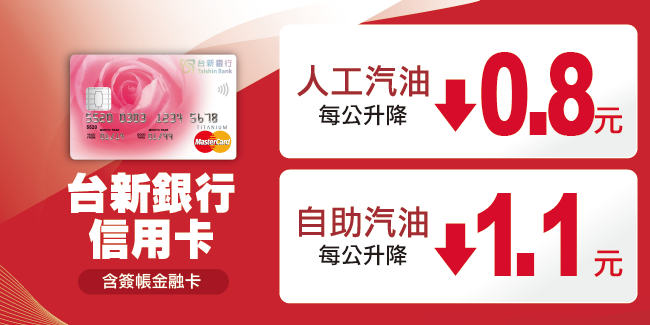 刷台新銀行信用卡汽油|人工每公升降0.8元、自助每公升降1.1元