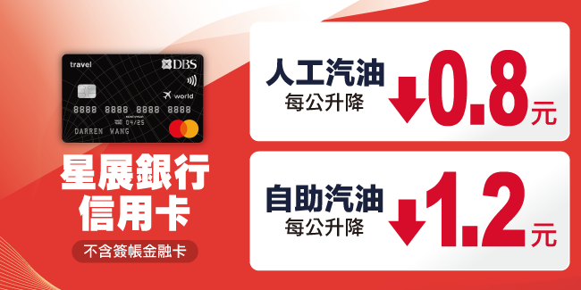 刷星展銀行信用卡汽油|人工每公升降0.8元、自助每公升降1.2元