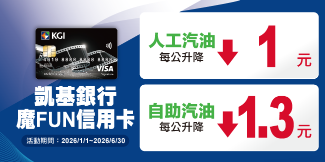 刷凱基銀行信用卡汽油|人工每公升降1元、自助每公升降1.3元