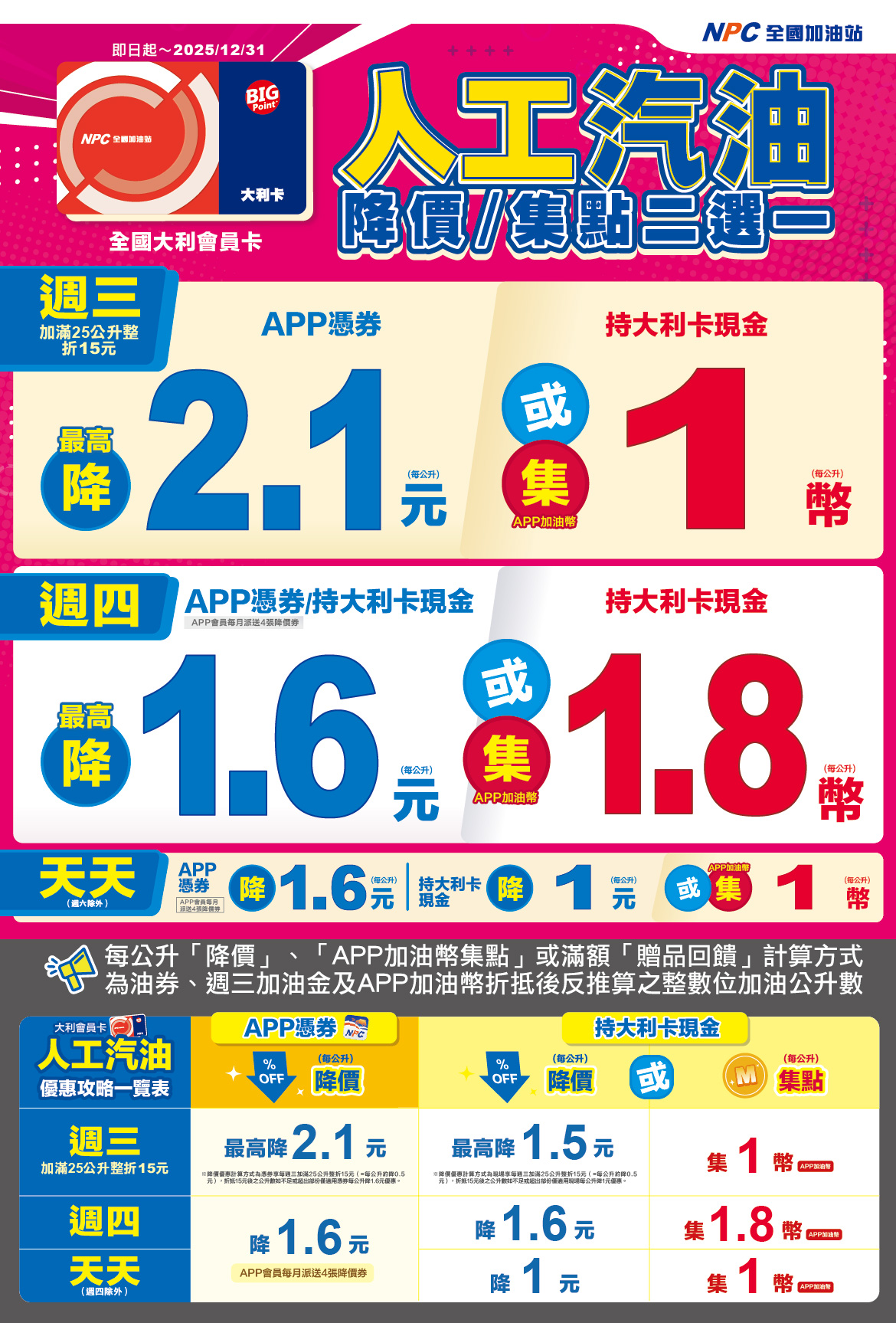 1.APP憑券降價優惠限活動期間下載全國加油站APP成功並註冊登入會員;聯名卡會員新戶下載送4張一個月有效汽/柴油任意選行動降價券(已下載舊戶每月送行動降價券4張);大利卡會員(含已下載舊戶)每月送4張汽/柴油任意選行動降價券。(如同時持有聯邦全國加油聯名卡及全國大利會員卡,系統每月僅會擇優派送聯名卡會員專屬汽/柴油任意選降價券4張)
