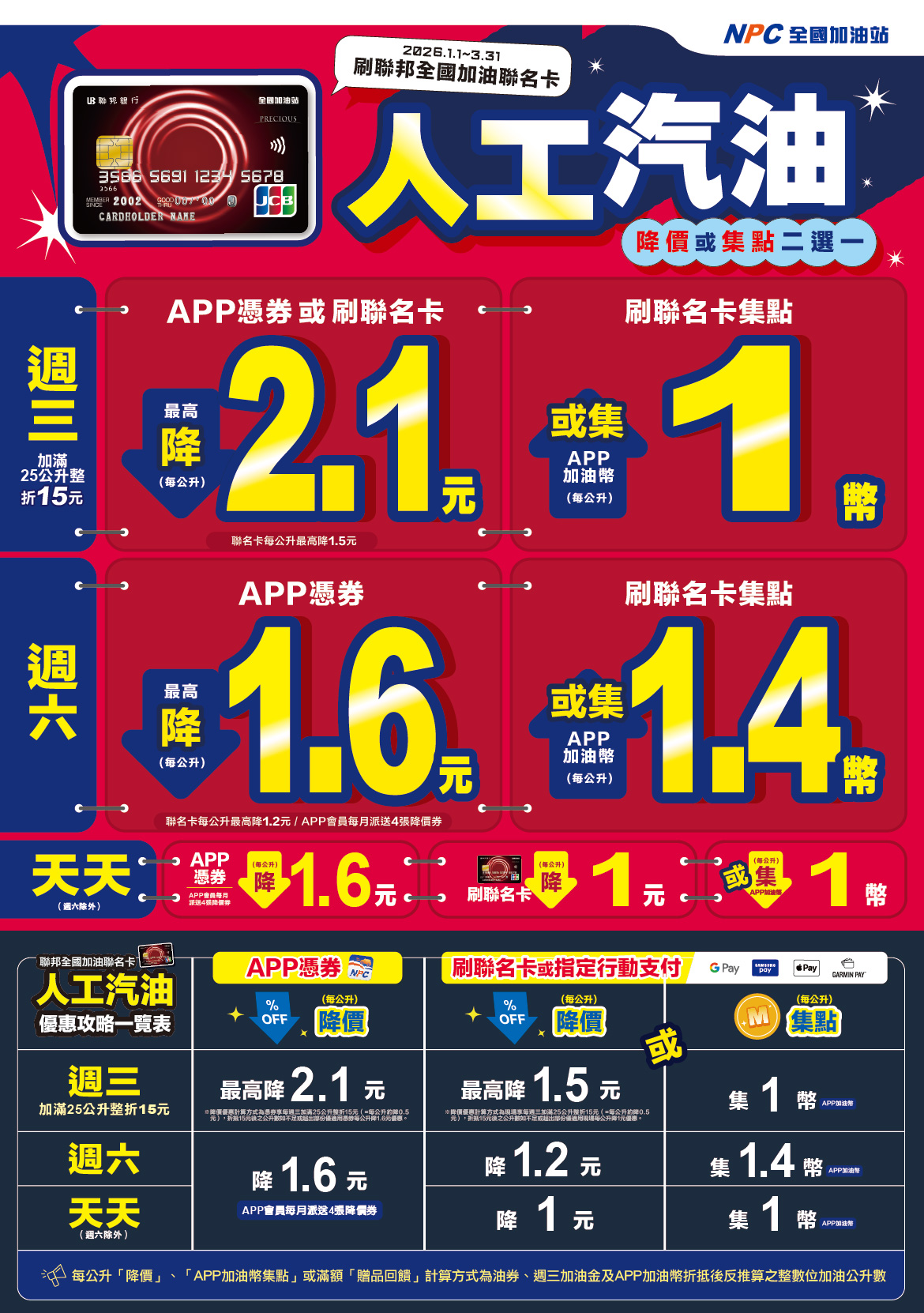 1.優惠活動限指定活動日持聯邦全國加油聯名卡刷卡加油滿1公升以上或以聯名卡綁定指定行動支付(包含Apple Pay、Samsung Pay、Google Pay及Garmin Pay等NFC感應支付;全國加油聯名卡JCB晶緻卡僅限 Apple Pay 可加載)加油滿1公升以上;自助加油單筆刷卡加油最高交易限額為新台幣3,000元為上限(Mastercard行動支付為2,250元)或汽油100公升為上限(限指定之全國加油站並使用自助加油島之自助加油設備加油,不含撫遠站、桃園大興西路站、桃園龜山站、桃園龍岡站、大園國際路站、楊梅幼獅站、新竹經國站、台中大雅站、台南安定交流道站、台南新市交流道站、台南永成路站及高雄仁武站),人工加油每筆刷卡加油降價回饋上限為汽油120公升或柴油400公升,油品限加入單輛車輛油箱內。