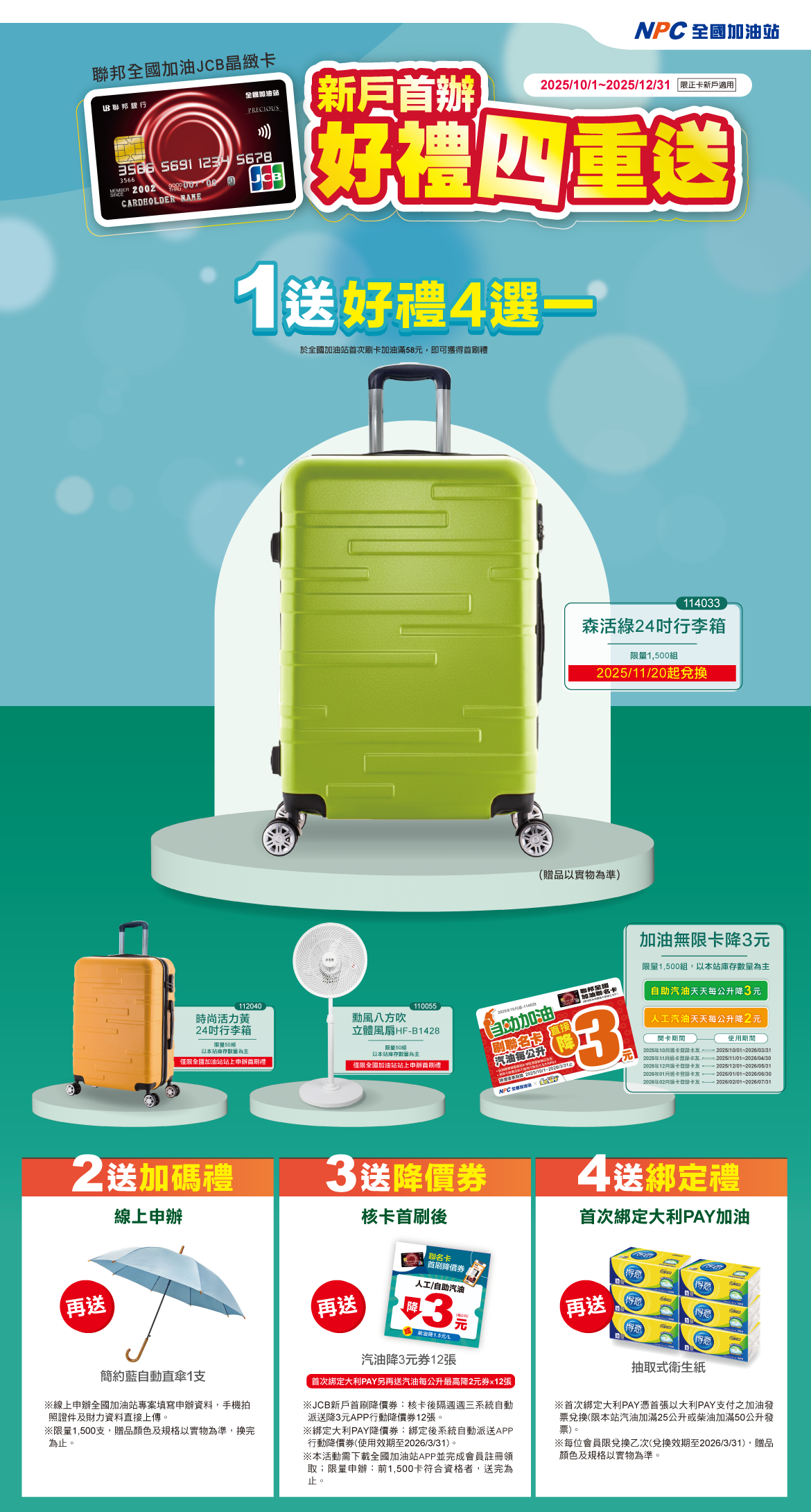 2、本活動適用2025/10/1-2025/12/31前申辦「聯邦全國加油聯名卡正卡」且於2026/1/31前核卡者,並於2026/2/28前於全國加油站首刷加油單筆金額達新台幣58元(含)以上,即可持該筆消費簽單至全國加油站換禮中心(8:00am~8:00pm)過卡認證後兌換新戶首刷禮四選一【森活綠24吋行李箱(限量1,500組,2025/11/20起兌換)、時尚活力黃24吋行李箱(限量50組,僅限全國加油站站上申辦)、勳風八方吹立體風扇(限量50組,僅限全國加油站站上申辦)或加油無限卡(限量1,500組)】,核卡日期以聯邦銀行系統註記之建檔日為準,首刷禮採限量提供,數量有限兌完為止,贈品兌畢以全國加油站網頁公告為準。