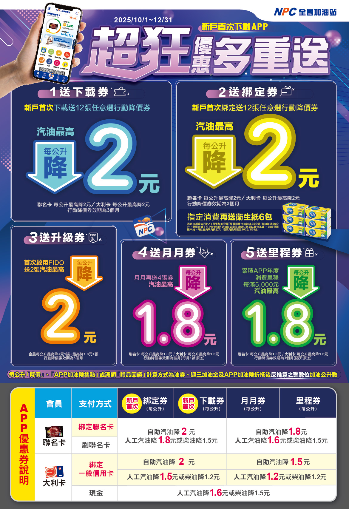 6.聯名卡會員下載新戶是指從未下載全國加油站APP客戶;聯名卡綁定大利PAY新戶是指首次以聯名卡會員身分綁定聯名信用卡客戶;大利卡綁定大利PAY新戶是指首次以大利卡會員身分綁定一般信用卡成為大利PAY客戶。系統自動派送之行動降價券僅限註冊成功之會員登入APP後方能查看與使用,優惠券使用方式請以APP優惠券頁面公告為準,使用優惠券消費不得再與其他優惠活動合併使用,降價券系統派送時間為2025年10月1日至2025年12月31日;當月1日系統自動派送當月份月月送降價券,會員請在APP「優惠券」中查詢。