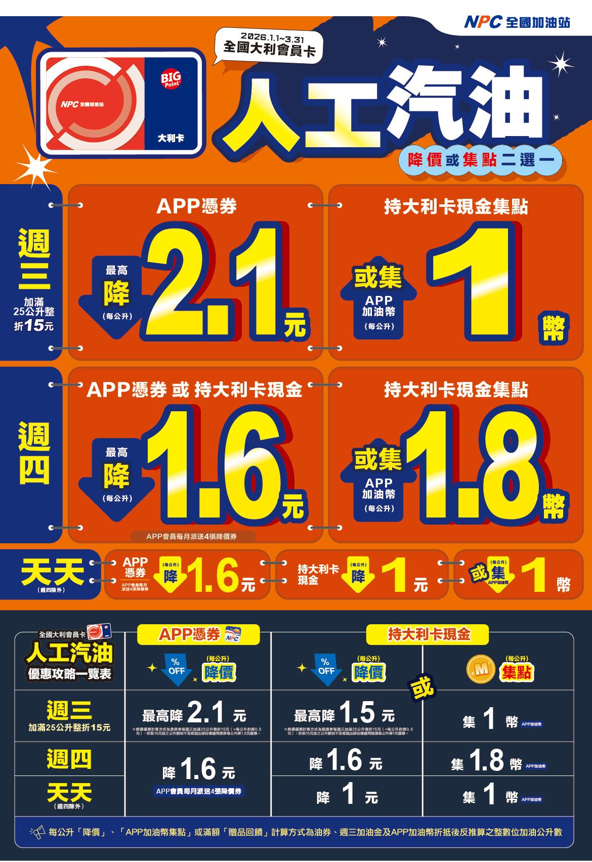 2.持有效之大利卡於全國加油站之人工加油消費可選擇「降價」或「APP加油幣集點」二選一(選擇「APP加油幣集點」需下載「全國加油站APP」並成功完成會員註冊程序),每公升「降價」、「APP加油幣集點」或滿額「贈品回饋」計算方式為油券、週三加油金及APP加油幣折抵後反推算之整數位加油公升數(不滿1公升者則不予降價或集點)乘以每公升回饋之「降價金額」或「APP加油幣」,累計之「降價金額」或「APP加油幣」四捨五入後取整數位,小數點後不予累計,累積之「APP加油幣」效期為每次累積日起至次年3月31日到期,「APP加油幣」回饋比例及活動方式請依全國加油站現場文宣或網站公告為準,全國加油站保留活動變更及「APP加油幣」回饋比例調整及終止本活動之權利。