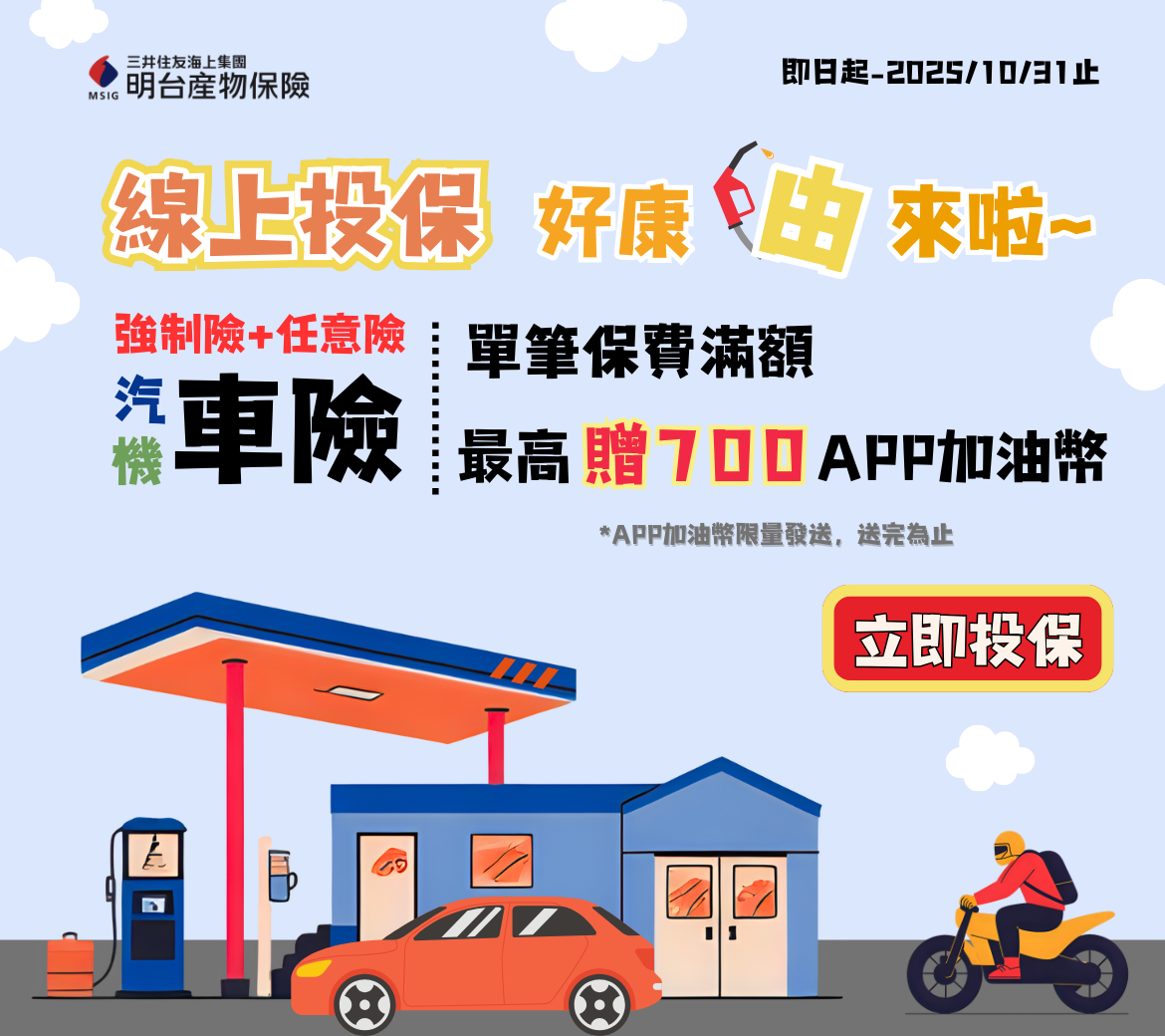 線上完成投保【汽機車(強制險+任意險) 】,核保完成之保戶,送APP加油幣,限量50,000幣送完為止。