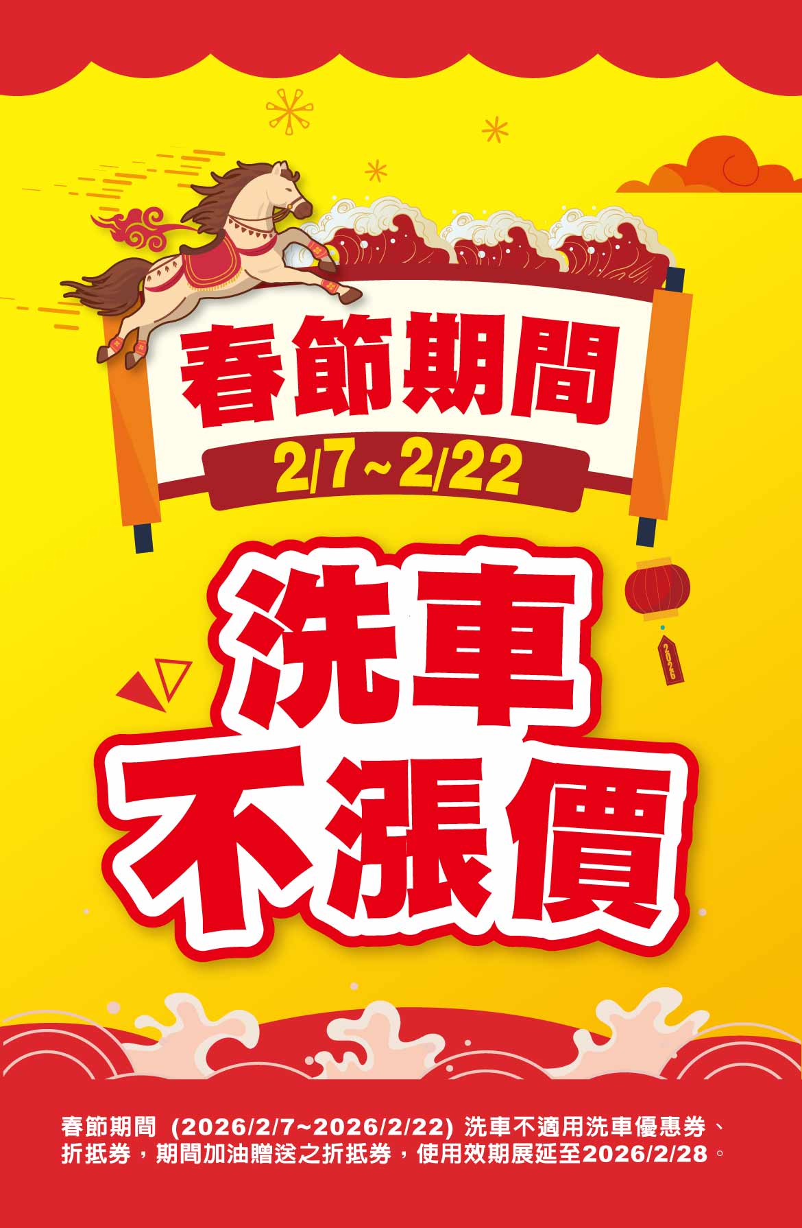 1.春節期間洗車不適用洗車優惠券、折抵券,期間加油赠送之折抵券,使用效期展延至2026/2/28(六)。